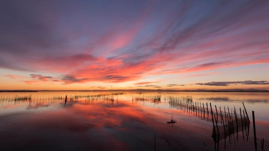 Para terminar el día, nada como volver al entorno del mar, pero desde un ángulo distinto: el de la Albufera de Valencia, un humedal único donde la luz del atardecer se refleja entre arrozales, barcas tradicionales y cañas ondulantes.